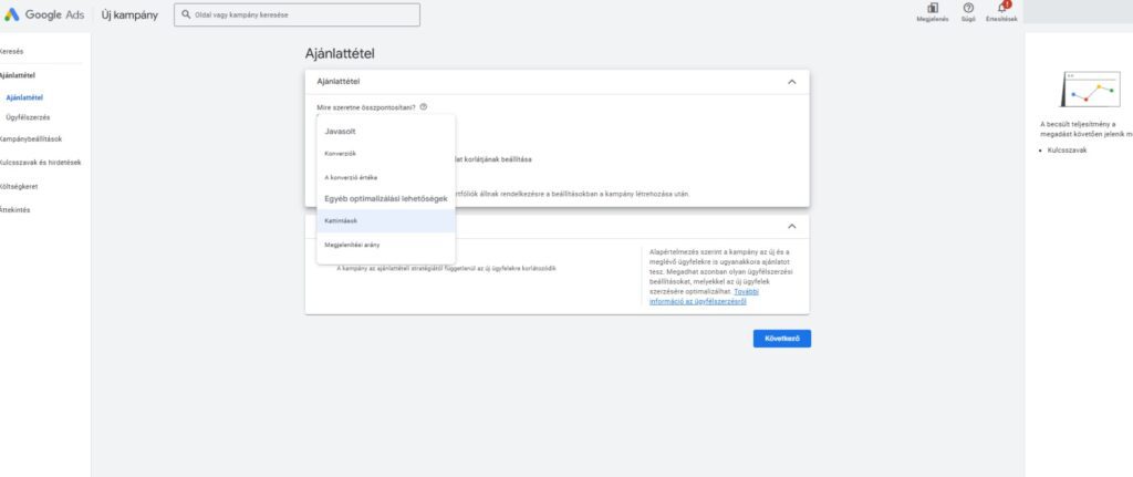 Ezután ki kell választanod az ajánlattételi stratégiát, vagyis, hogy mire szeretnél összpontosítani a kampányoddal. Új fiók esetén, ahol még nincsenek konverziós adatok azt javasoljuk, hogy a “Kattintások” lehetőséget válaszd. Ebben az esetben a rendszer arra fog törekedni, hogy minél több kattintást ki tudjon hozni a költségkeretedből. A későbbiekben ezt a beállítást bármikor módosíthatod az aktuális céljaidnak megfelelően.