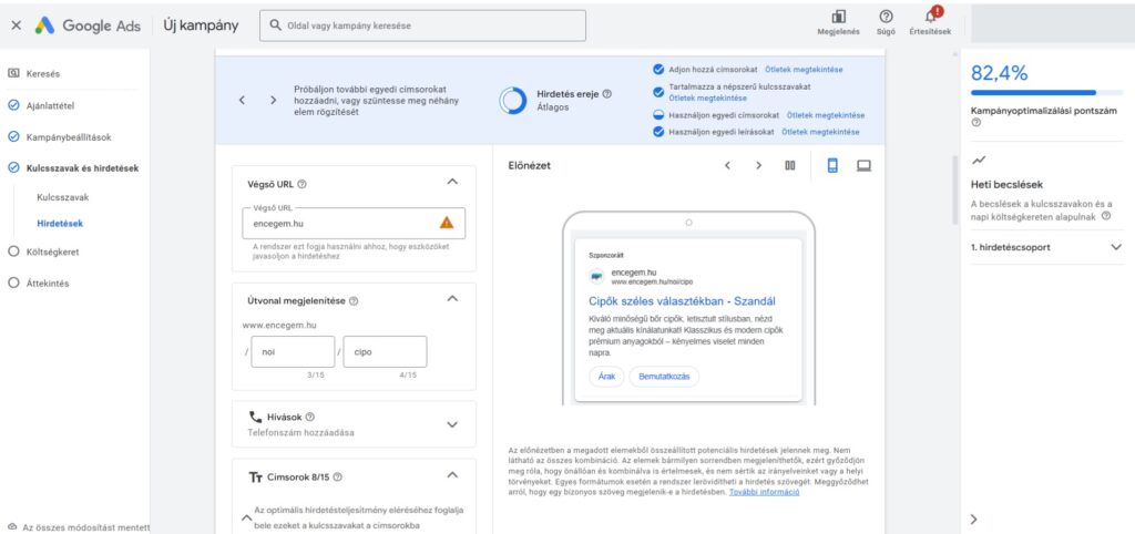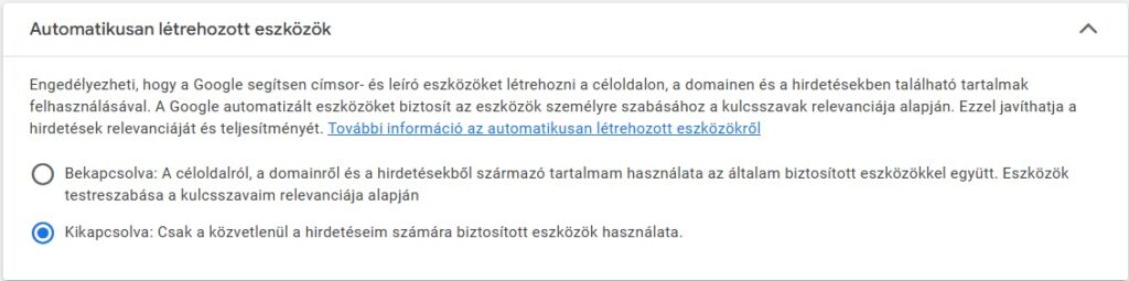 A kampánybeállítás során lehetőséged van engedélyezni, hogy a Google automatizált eszközöket használjon a hirdetések címsorainak és leírásainak létrehozásához. Ebben az esetben a Google a céloldaladon, a teljes domainen, valamint a már meglévő hirdetéseidben található tartalmakat elemzi, és ezek alapján javasol vagy generál hirdetésszövegeket.