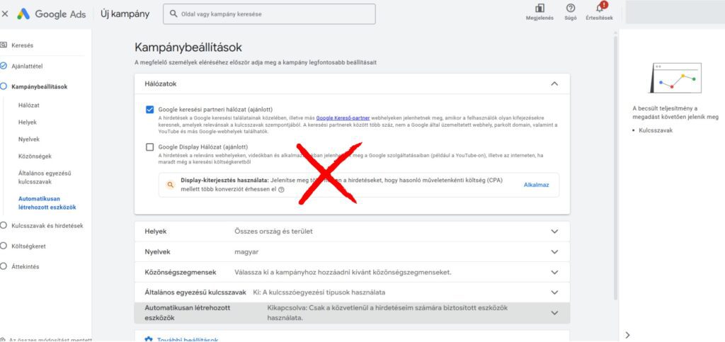 A következő résznél azt javasoljuk, hogy módosítsd a Google alapértelmezett beállítását és a hálózatok közül csak a “Keresési Hálózatot” jelöld be.