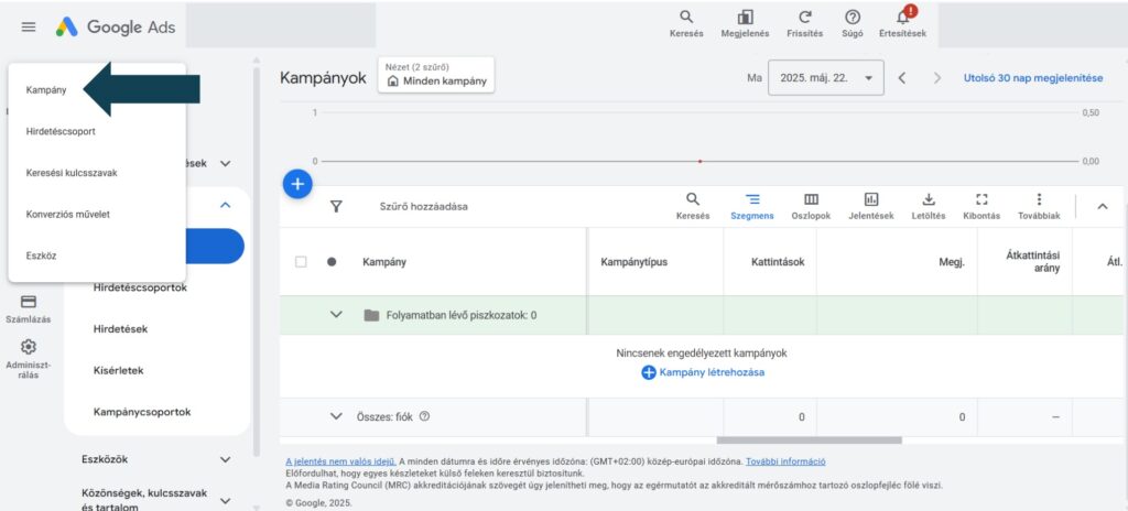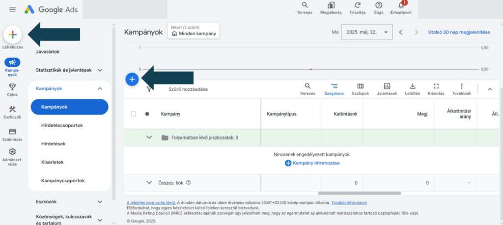 A kiválasztott fiókban a „Kampányok” menüpontra kattintva megtekintheted az aktuálisan futó kampányaidat, és ugyanitt, a felület bal felső sarkában található kék „+” jelre kattintva új kampányt is létrehozhatsz. Alternatív megoldásként a bal oldali menüsáv tetején elhelyezkedő „+” jel segítségével szintén indíthatsz új kampányt.