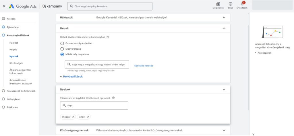 A nyelv kiválasztásánál vedd fel az angolt is a magyar mellett. A hirdetéseid természetesen magyarul fognak megjelenni, azonban sokan használják a böngészőt angol beállításokkal.