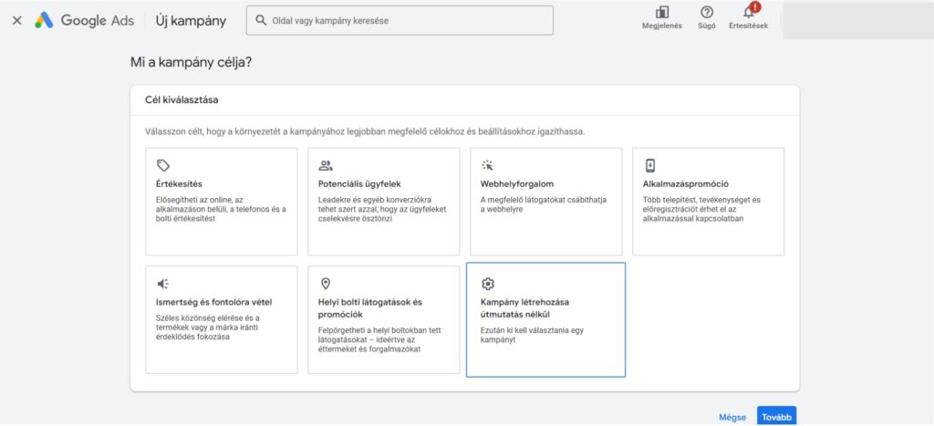 Választhatsz a megadott kampánycélok közül, de mi azt javasoljuk, hogy válaszd a “Kampány létrehozása útmutatás nélkül” lehetőséget, mert így a további beállításoknál minden választható opció a rendelkezésedre áll majd.