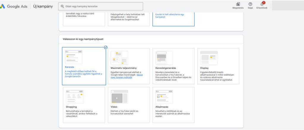 Ennél a lépésnél választjuk ki a kampány típusát is.