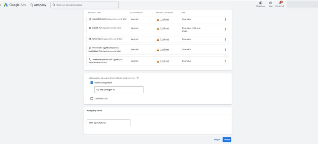 3. lépés: Konverziós célok kiválasztása és a kampány elnevezése